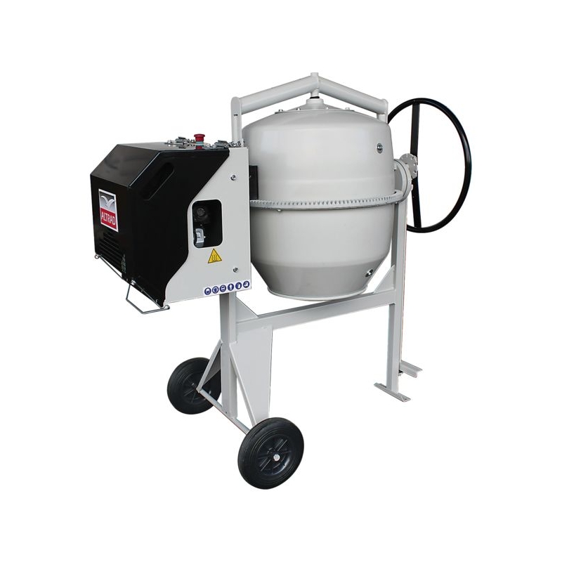 Usage peu intensif. Volant avec démultiplication en fonte. Capacité de cuve : 170 L Capacité de malaxage : 150 L (1 sac de 35 kg) Moteur : électrique 850 W, 230 V mono Roues : pleines Ø 250 mm Indice de protection : IP 44 Poids : 75 kg