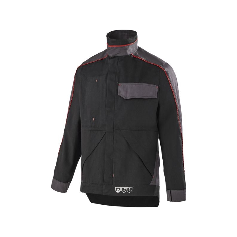 99% coton, 1% fibre antistatique, 335 g/m². Protection pour les travaux de soudage de classe 1 à sollicitations faibles à moyennement fortes. Col montant, fermeture à glissière sous-patte. 1 poche poitrine avec rabat fermé, 2 passants portes dosimètres, 1 poche poitrine intérieure napoléon fermée, 2 poches basses fermées. Ceinture fermée par pressions, couvre-reins. Poignets à soufflets fermés. Collerette de marquage. Pictos brodés sur le vêtement. Entretien : lavage industriel Coloris : noir/gris Tailles : 1(40/42) à 3(48/50) Normes : CE Cat III - EN ISO 11611 A1+A2 classe 1 - EN ISO 11612 (A1.A2.B1.C1.E2.F1) - EN 1149-5 - EN 15797