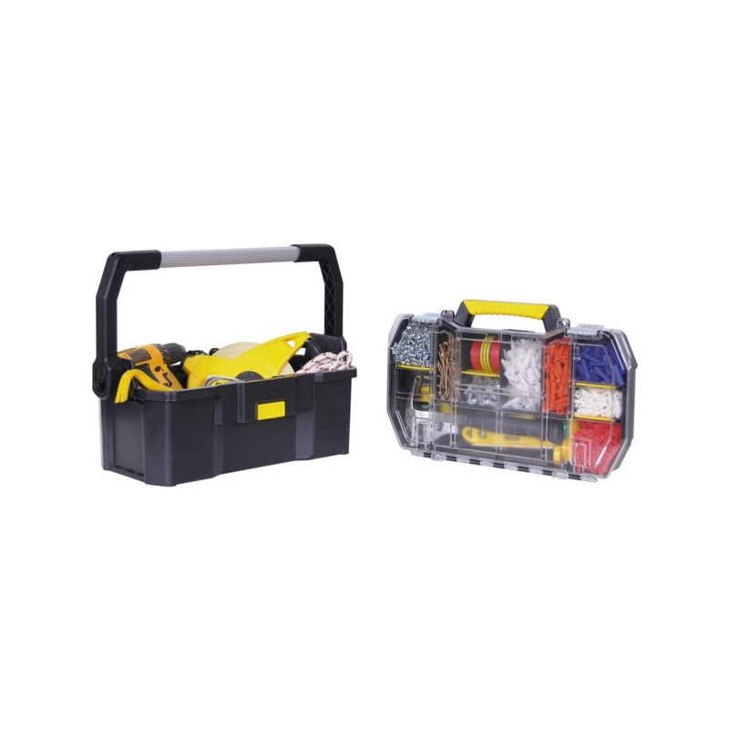 Caisse avec organiseur pour la visserie et petits accessoires. Bouton sur le devant pour libérer la partie haute de la caisse. Grande poignée en aluminium pour faciliter le transport. Volume utile : 53 l Charge maxi : 18 kg Dimensions : 670 x 323 x 283 mm Livrée sans outils.