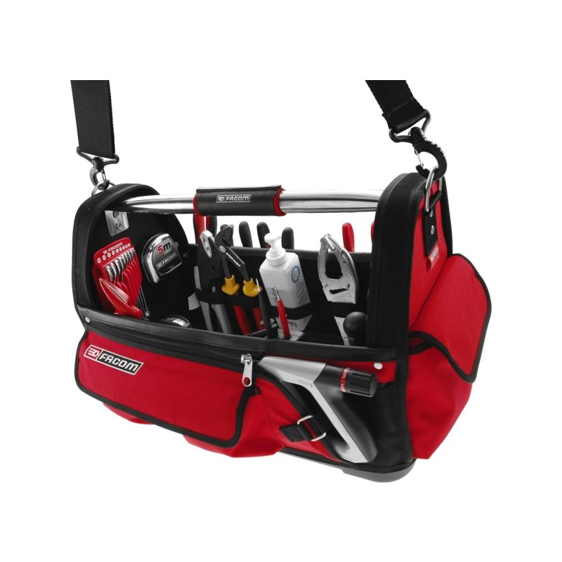 Soute en polypropylène rigide et étanche. Fermeture par capote souple. Poignée aluminium. Sangle d?épaule avec coussin de renfort au niveau de l?épaule. Rangement vertical, sangle élastique de maintien des outils, rack latéral pour les tournevis, poches latérales. Livrée sans outils.