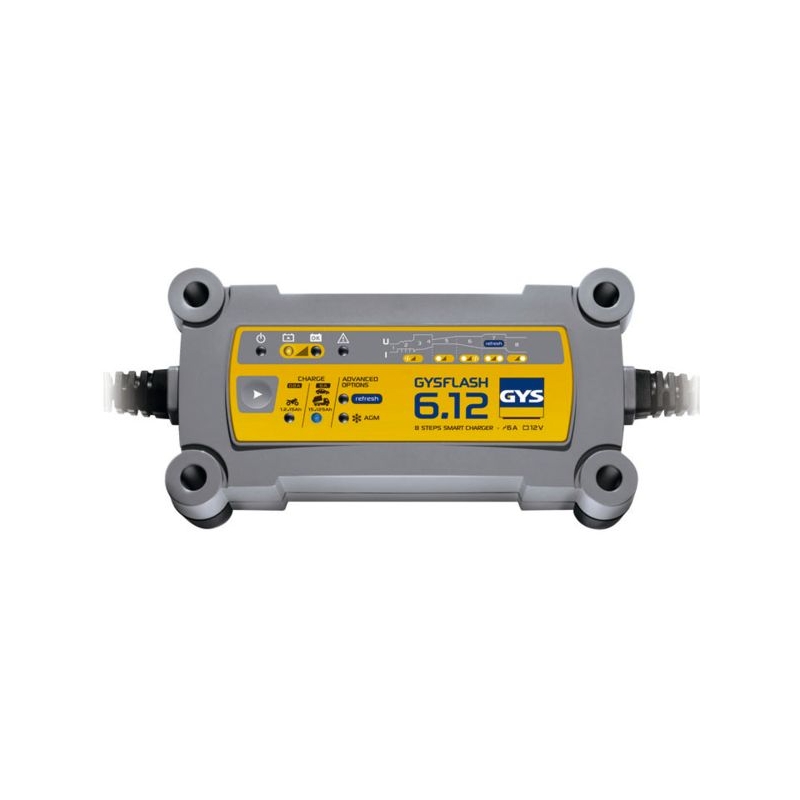 Charge automatiquement sans surveillance, tous types de batteries 12 V (acide-plomb). Pour tous types de voitures, utilitaires, camping-car ou camions. Protection de l'électronique embarquée. Pas besoin de déconnecter la batterie du véhicule pendant la charge. Recharge même les batteries fortement déchargées. Alimentation : 230 V Livré avec pinces, cosses M6 (sauf pour Gysflash 8.12)