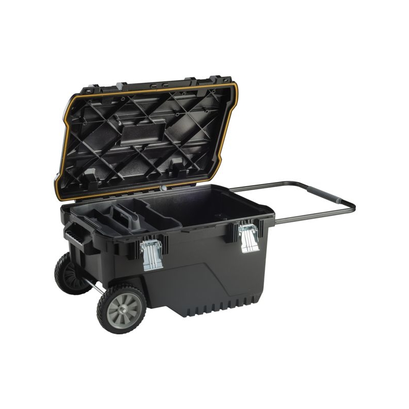 Large couvercle utilisable comme surface de travail. Rainure en V pour des coupes d'appoint. Larges attaches métalliques. Roues grand diamètre tout terrain. Poignée télescopique coulissante pour faciliter le transport. Étanche à l'eau et à la poussière. Cadenassable. Volume utile : 90 L Dimensions (L x l x H) : 748 x 516 x 430 mm Indice de protection : IP54 Livré sans outils.