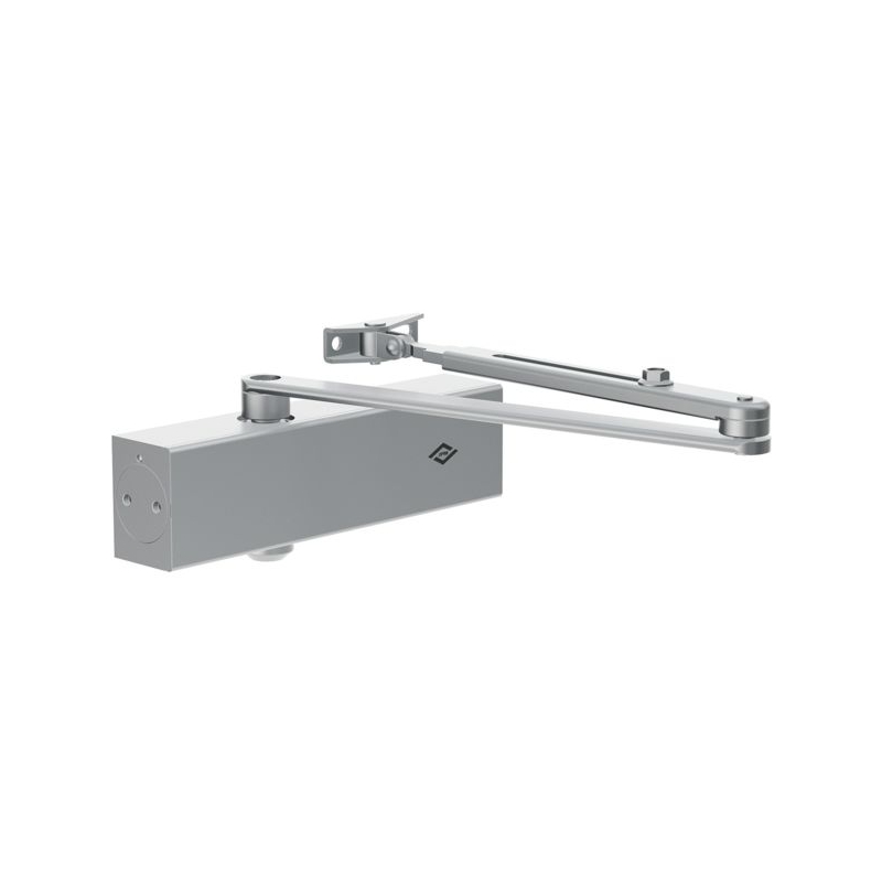 Technologie pignon et crémaillère, bras compas. Force variable 2 - 3 - 4 ou 5 par positionnement du corps. Vitesse de fermeture, à-coup final et frein à l'ouverture réglables en façade. Certifié CE EN1154. Permet le respect de la loi PMR (Personnes à Mobilité Réduite). Largeur du vantail : jusqu'à 1250 mm Poids du vantail : jusqu'à 100 kg Angle maximum d'ouverture : 180° Finition : argent Conditionnement : boite