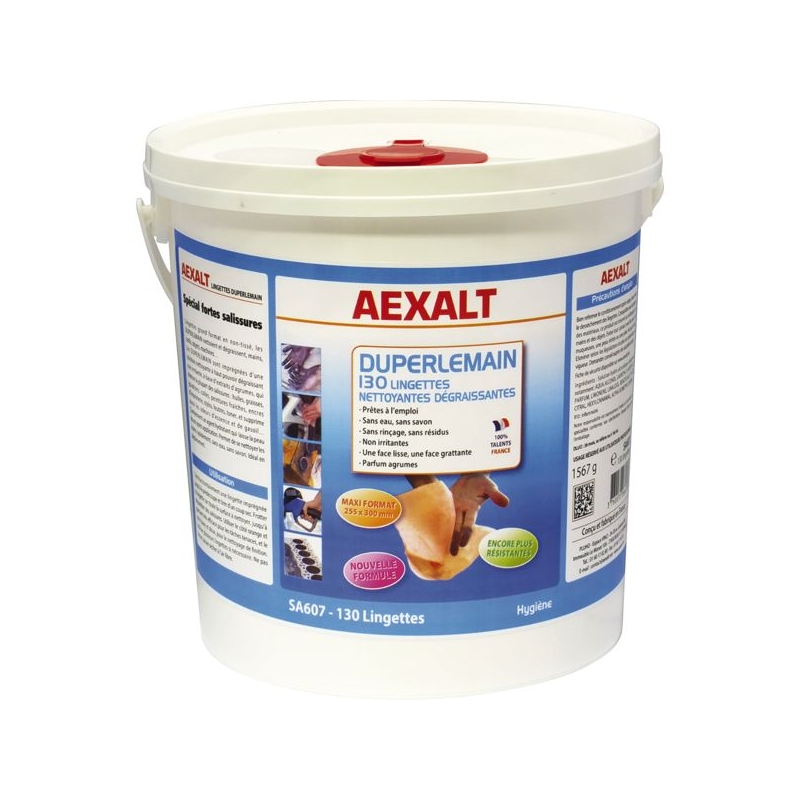 Pour salissures très fortes. Lingettes nettoyantes pour les mains et les surfaces. Imprégnées d?une solution nettoyante à haut pouvoir dégraissant, non irritante, à base d?extraits d?agrumes, qui élimine la plupart des salissures. Formule enrichie en Vitamine E, Aloe Vera et Glycérine qui laisse la peau douce après application. Permet de se nettoyer les mains rapidement, sans eau, sans savon. Idéal en déplacement. Efficace contre : huiles, graisses, goudrons, colles, peintures fraîches, encres d?imprimerie, stylos, feutres, toner, odeurs d?essence et gasoil Utilisation : extérieur, industrie lourde, industrie générale et légère, construction, maintenance et réparation automobile, marine.