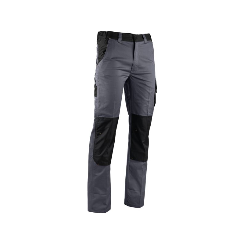 60% coton 38% polyester 2% élasthanne, 280 g/m². Ceinture élastiquée côtés, 5 passants, braguette zippée. 2 poches devant, 2 poches flottantes escamotables à multiples compartiments et porte outils, 1 poche cuisse porte outils à soufflet fermée par rabat, 2 poches dos à soufflets fermées par rabats, 1 poche mètre. Poches pour genouillères réf 103440 (à commander séparément). Coloris : gris/noir Taille : 40 à 52 Norme : CE Cat II EN ISO 14404 si porté avec les genouillères
