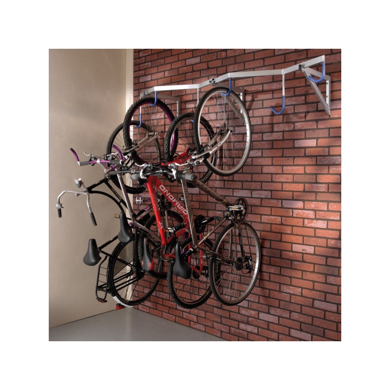 Support mural pour 6 vélos. Solution idéale lorsqu'il y a peu de place disponible au sol. Fabrication solide en acier zingué. Crochets gainés décalés permettant un gain de place maximum. Anneaux antivol. Dimensions (L x H x P) : 200 x 36 x 51.1 cm Visserie non fournie.