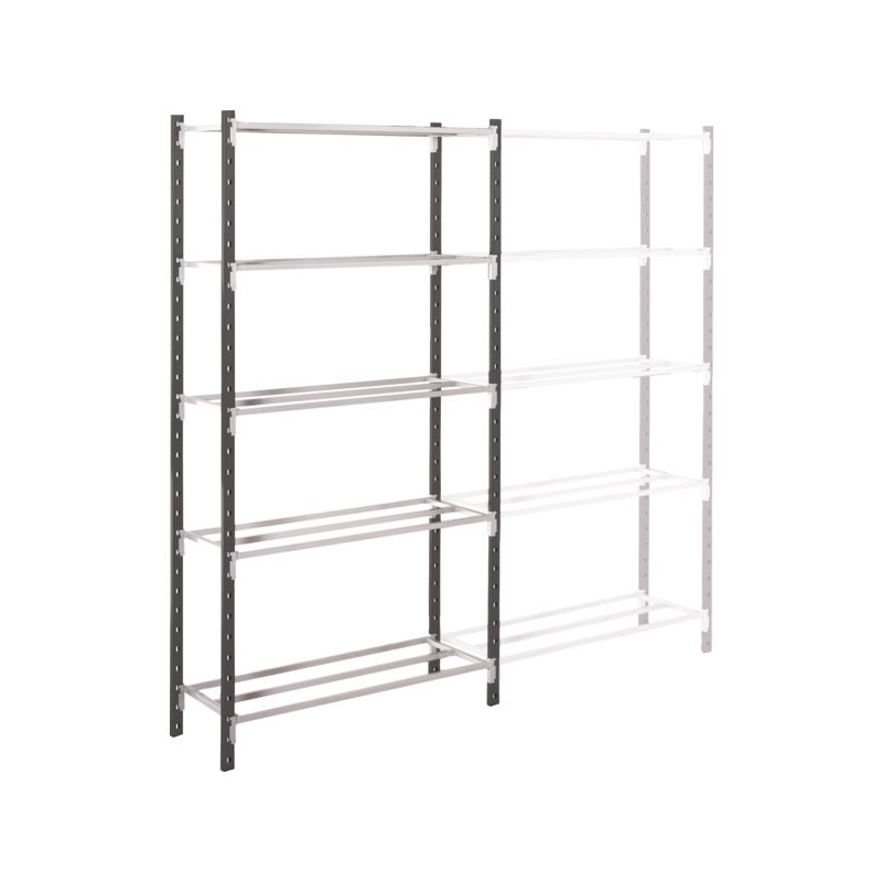 Composé de 5 niveaux en tablettes tubulaires à connecteurs réglables au pas de 62,5 mm. Idéal pour le stockage de pièces mécaniques, bacs plastiques, outillage. En option, dessus de tablette préconisés pour le stockage de petites pièces, en isobois de 2,5 mm d'épaisseur. Utilisation en simple et double face. Tablette monobloc rigide, permettant un montage et démontage très rapide, sans outils ni visserie. Finition peinture époxy montants bleus et tablettes gris perle. Livré démonté. Autres dimensions, configurations et coloris disponibles sur consultation. Capacité de charge : jusqu'à 250 kg uniformément réparti selon configuration. H x l : 2000 x 1000 mm Poteaux gris anthracite (RAL 7024) et tablettes gris perles (RAL 7035)