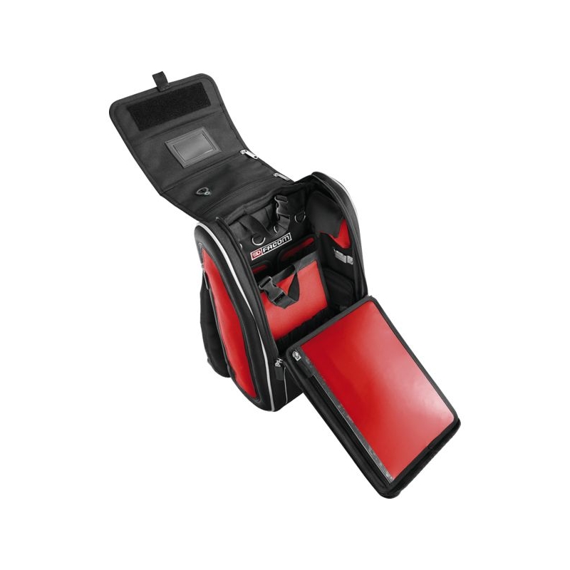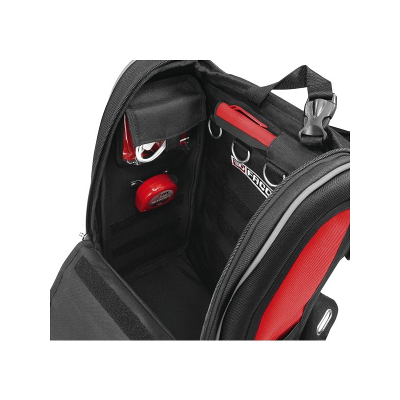 Permet de passer dans des espaces confinés. Compatible avec les échelles à crinoline. Fermetures à glissières cadenassables. Pochettes de rangement amovibles à positionnement libre grâce aux bandes de fixation (Velcro), avec élastique pour les outils. ?illets extérieurs ovales pouvant porter jusqu'à 0,5 kg chacun. Bretelles matelassées, ergonomiques, poignée sur le dessus. Bandes réfléchissantes sur l'avant et les côtés. Charge maxi : 10 kg Dimensions : 300 x 180 x 480 mm Livré sans outils.