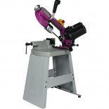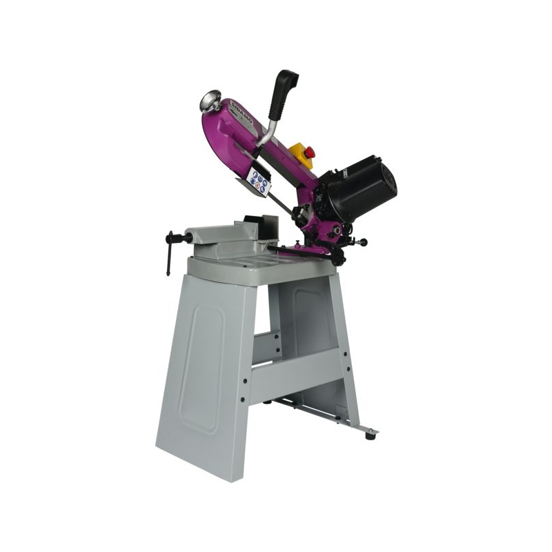 Archet en fonte aluminium pivotant pour coupes à 60° à gauche. Poignée interrupteur gâchette. Variateur de vitesse électronique. Arrêt coup de poing à accrochage. Alimentation : 230 V monophasée Puissance : 0,3 kW Dimensions ruban : 1440 x 13 x 0,6 mm Vitesse ruban : 23 à 75 m/mn Poids : 27,5 kg Capacité de coupe (mm) : Angle Rond Carré Rectangle 90° 120 120 120 x 120 45°G 77 77 77 x 120 60°G 40 40 40 x 65 Livrée avec butée de couple et socle.