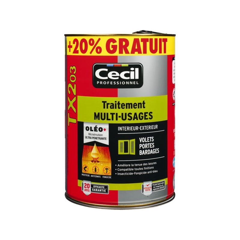 Pour tous types de bois intérieurs et extérieurs. Insecticide et fongicide puissant. Agit en profondeur. Application en badigeonnage, au pistolet ou au pulvérisateur. Nettoyage des outils à l'eau. Rendement : - en curatif sur support attaqué : 3 m²/l - en préventif sur support sain : 5 m²/l Recouvrable : 24 h Dangereux - Respecter les précautions d'emploi. Utilisez les biocides avec précautions, avant toute utilisation, lisez les étiquettes et les informations concernant le produit.