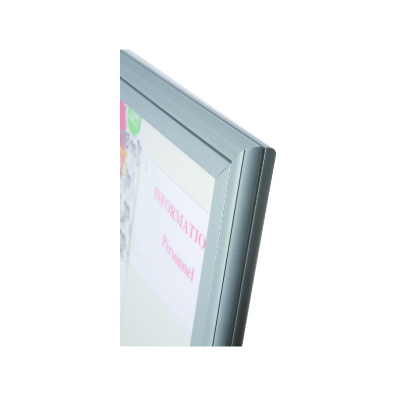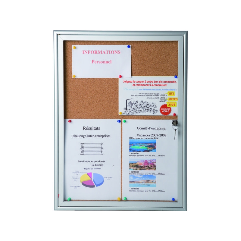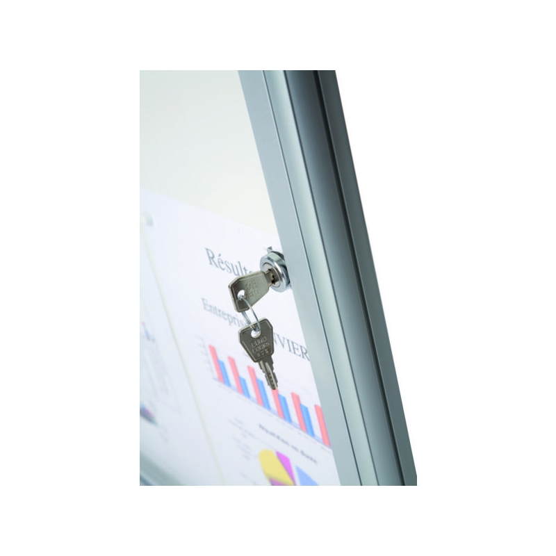Porte battante démontable, encadrement aluminium et vitrage méthacrylate. Serrure à clé dans le vitrage. Fixation murale 4 points. Épaisseur hors-tout : 32 mm Épaisseur utile fond tôle/liège : 22/13 mm Version en verre Securit 4 mm d'épaisseur sur consultation.